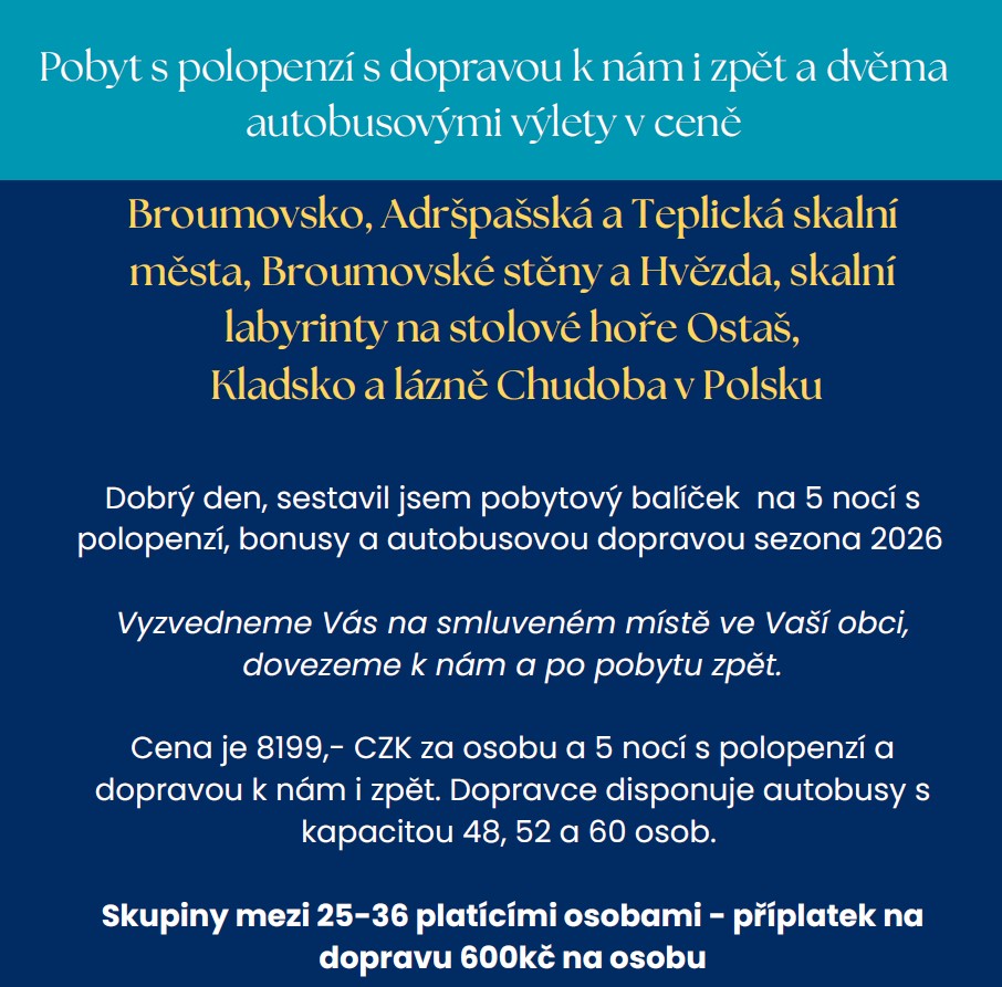 Sestavili jsme pro vás pobytový balíček na 5 nocí s polopenzí v termínu 14. - 19. 6. 2026, v hotelu Praha v Broumově. Těšit se můžete na oblasti Broumovska, zahrnující Adršpašská a Teplická skalní města, Broumovské stěny a další přírodní krásy. Cena 8199 Kč zahrnuje dopravu z vaší obce a zpět, s možností ubytování pro skupiny. Pro skupiny mezi 25-36 platícími osobami je příplatek na dopravu 600 Kč na osobu. Neváhejte a využijte této nabídky pro pohodový pobyt v přírodě.