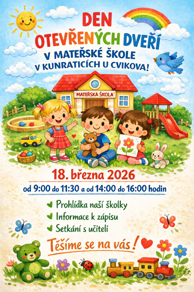 V Kunraticích u Cvikova se koná prohlídka mateřské školy, která se uskuteční ve středu 18. března 2026 od 9:00 do 11:30 a od 14:00 do 16:00 hodin. Rodiče mají možnost se setkat s učiteli a získat informace k zápisu do mateřské školy. Přijďte se seznámit s prostředím školky a jeho nabídkou pro děti. Těšíme se na vaši návštěvu.