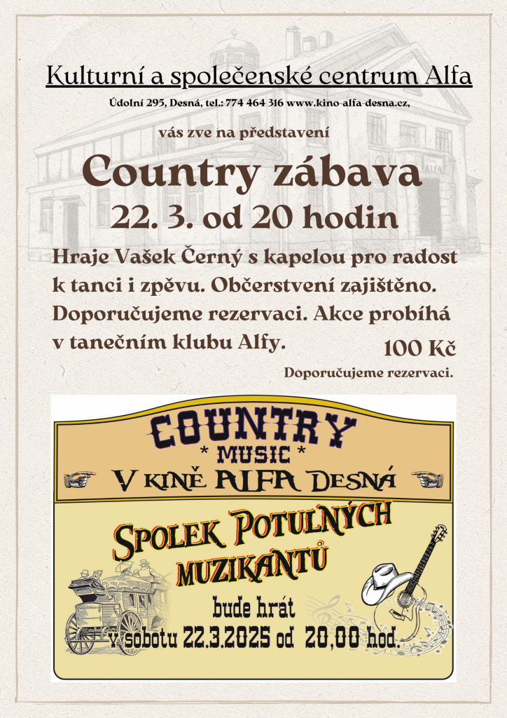 Country zábava v Kulturním a společenském centru Alfa, 22.3.2025 od 20:00 hodin