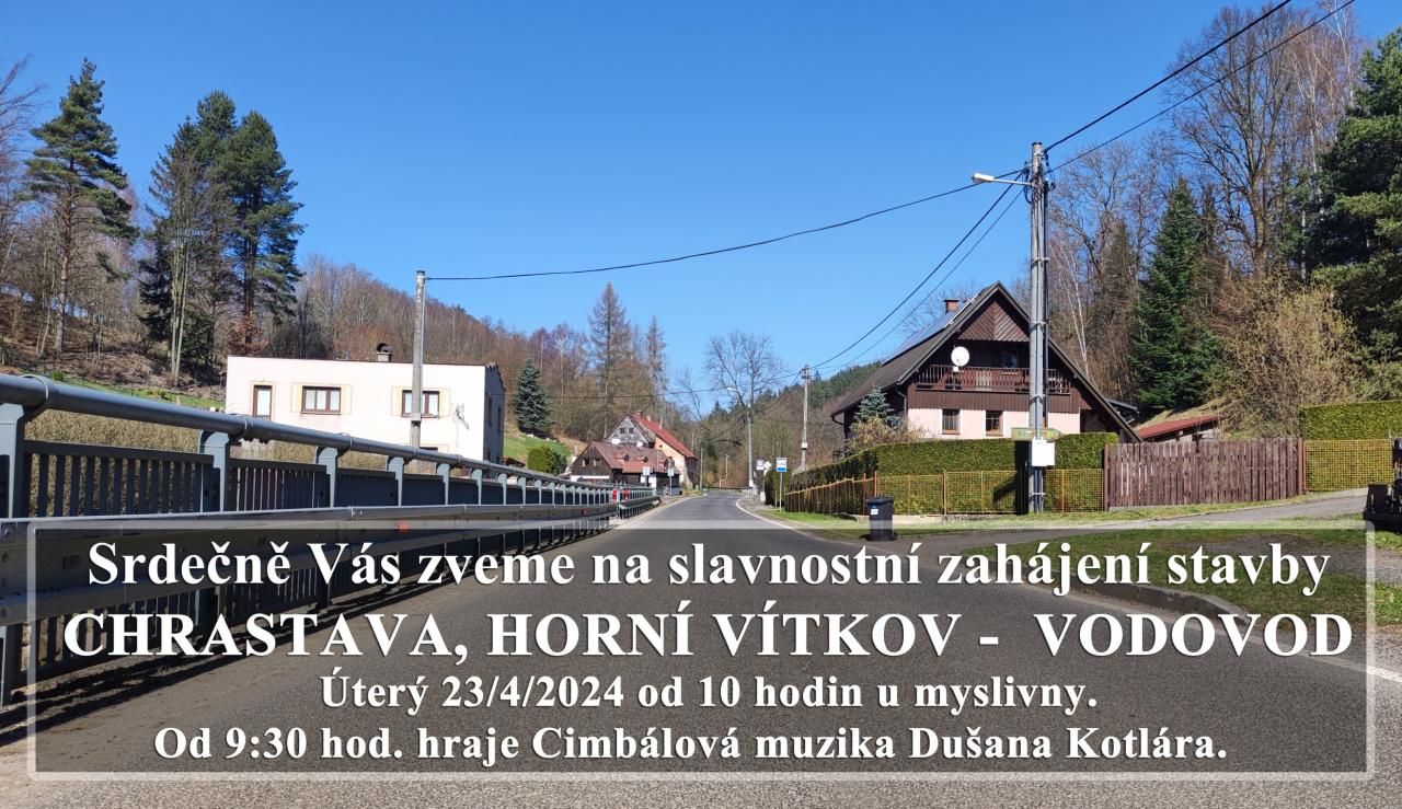 Slavnostní zahájení prací na vítkovském vodovodu, 23.4.2024. Začátek akce 9:30 u myslivny Vítkov. Hraje Cimbálová muzika Dušana Kotlára.